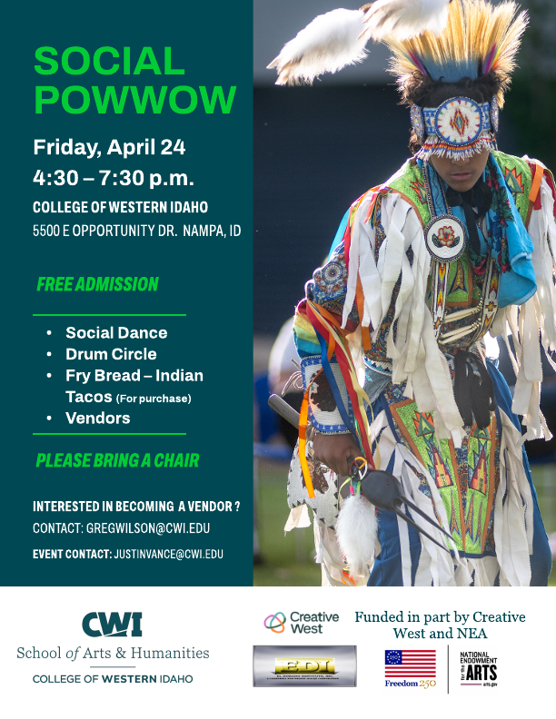 College of Western Idaho (CWI) will host a Social PowWow on Friday, April 24, at the Nampa Campus Quad. The event will bring together Native dancers, singers, and community members for an evening of cultural celebration.