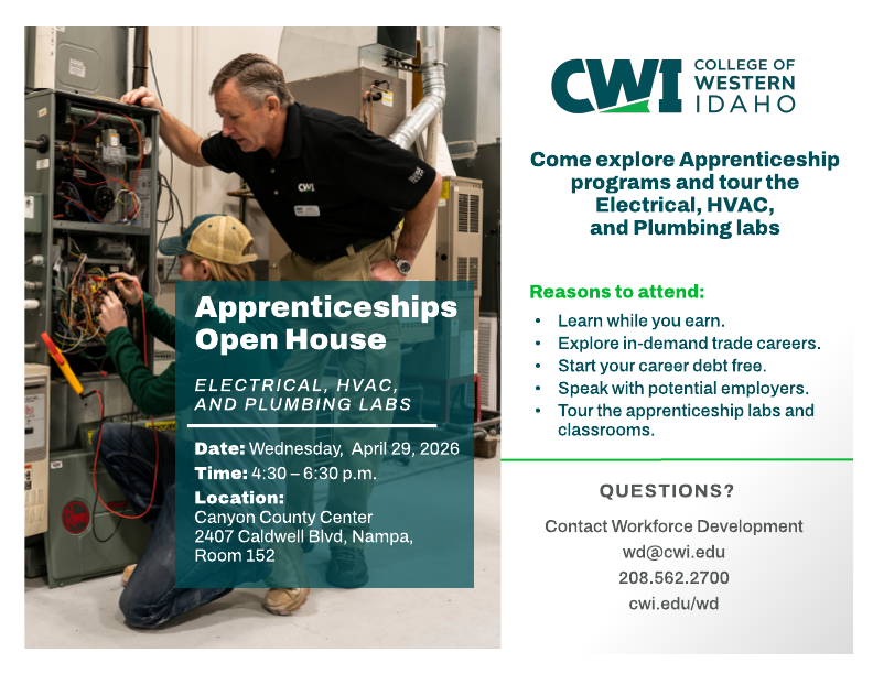 Join us to explore in-demand careers and training available through College of Western Idaho’s (CWI) Workforce Development's Electrical, HVAC, and Plumbing Apprenticeship programs. The Apprenticeship Open House is an opportunity to meet with instructors, students, and potential employers, ask questions, tour labs and classrooms, and learn more about a career in these in-demand fields.